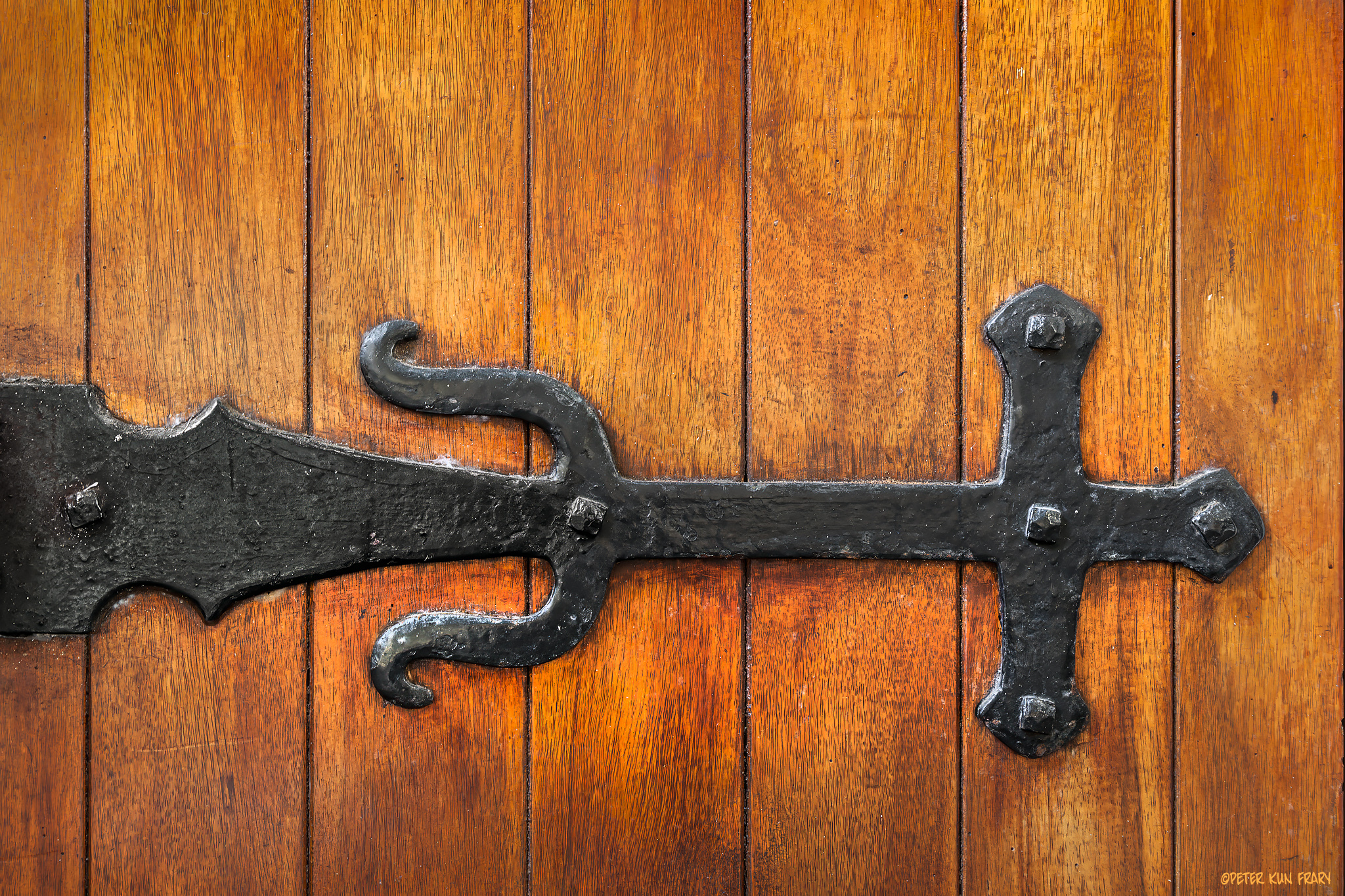 | These old mahogany church doors feature wrought iron hinges with square nails. I'm guessing the design is symbolic.