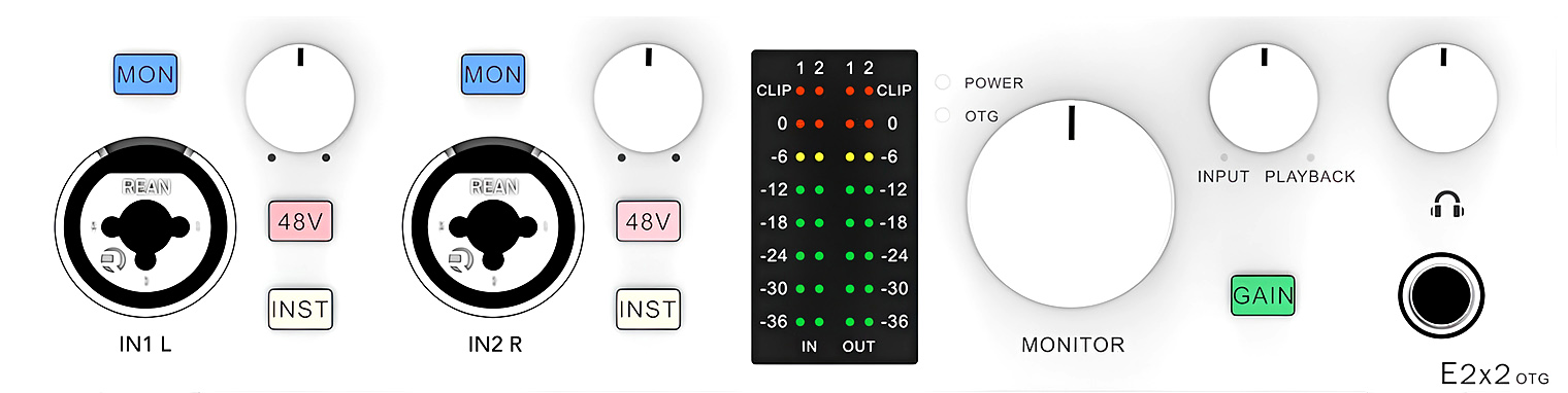 The E2x2 OTG, like the original E2x2, is a 2-in/2-out design. In other words, it has two input channels for mics or instruments and two output channels for stereo monitors. The star of the show are the two ultra-linear mic preamps with 58 dB of gain, 115 dB dynamic range, and -130.5 dBu EIN. That means they are ultra-clean and, to my ears, neutral and colorless.