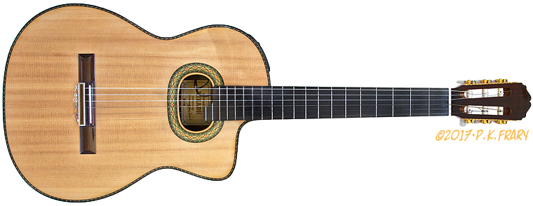 The oval rosette with inlaid marquetry is the most obvious cosmetic difference from a traditional classical and a design hallmark of the 90 series. This marquetry motif is further developed in the body binding, making for a bold and consistent statement of color and design. An over hanging 20th fret adds a high C to the first string, allows a three-octave C scale and helps one aim off-the-board artificial harmonics.