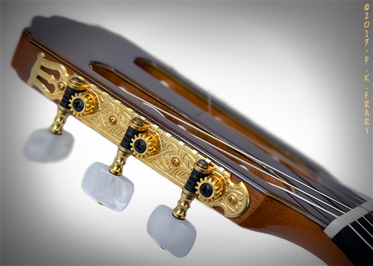 For decades the 90 series wore a set of deluxe Gotoh tuners with glossy gold finish, while rollers and knobs and 14:1 gear ratio. Plates are engraved with leaves and have the obligatory decorative Greek lyre. The look is heavy and traditional but doesn't match the delicate and modernistic style of the TH-90. Nevertheless, these tuners turn smoothly, hold pitch and allow for precise tuning. I recently saw a "just off the boat" TH-90 with tuner plates sans decorative Greek lyre (similar to LTD2012C tuners), a pleasing change.