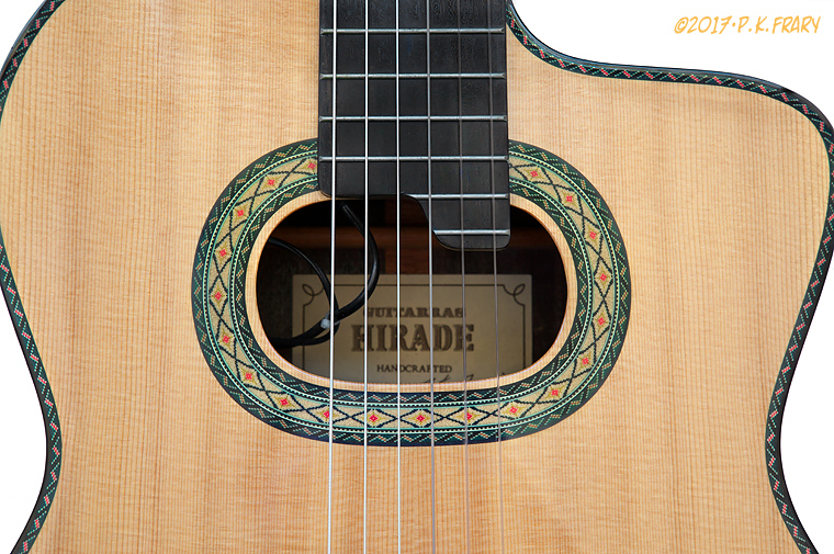 Takamine Gakki Seisakusho was founded in Japan in 1962, specializing in the manufacture of acoustic guitars. Hirade is Takamine's premium line of export classical guitars, originally designed by Mass Hirade in the 1960s and 70s. His early classical guitars were copies of the Jose Ramirez right down to the head stock design, purfling and chunky neck. By the early 1980s refinements were made, the neck slimmed down and the head stock morphed into the mustache profile used today.