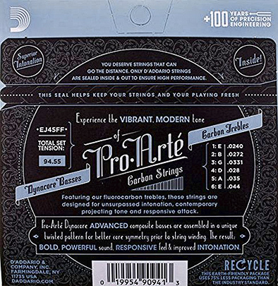 The treble strings of the EJ45FF set are made of fluorocarbon, a material orginally developed for fishing line. It's extremely tough, smooth and much more resistant to stretching and abrasion than nylon. It's also denser than nylon, resulting in a smaller diameter and increased tension. According to D'Addario, Carbon trebles are brighter than Extended Play and Dynacore and, indeed, my guitars really pop in the mix with Carbons.