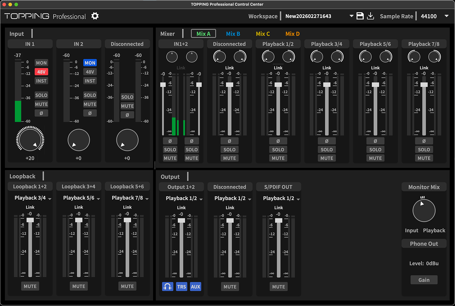 A small application with a grandiose title—Topping Professional Control Center (Pro Control)—is the only software provided. While optional for Macs, it is required for Windows. Pro Control is used to configure routing, loopbacks, digital gain, and some physical controls. Sample rate buffer settings are available for Windows but not for Macs. For Macs, buffer and sample rates are configured in your DAW.